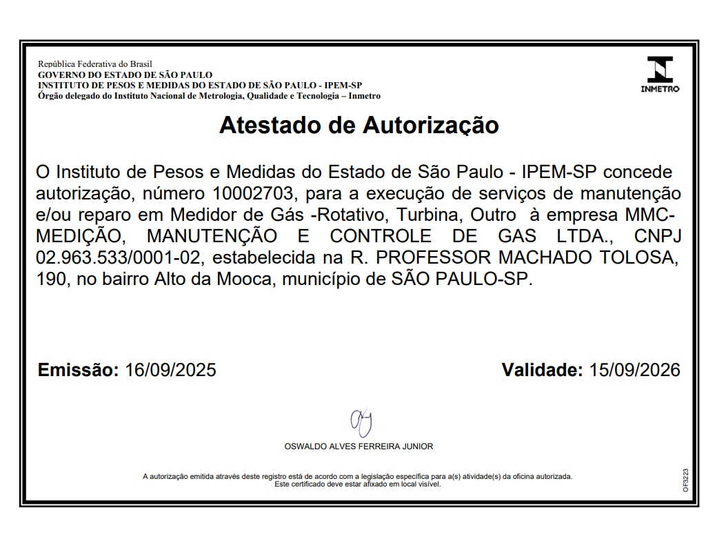 A MMC Gás é pioneira no setor de manutenção e reparo de medidores de gás no Brasil. Com nosso compromisso inabalável com a excelência, qualidade e segurança, temos o orgulho de anunciar que fomos a primeira empresa no país a receber a certificação de autorização do INMETRO.